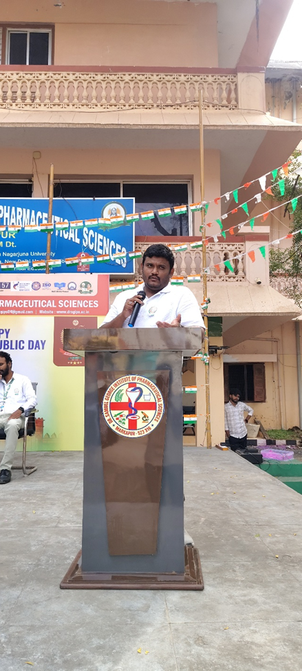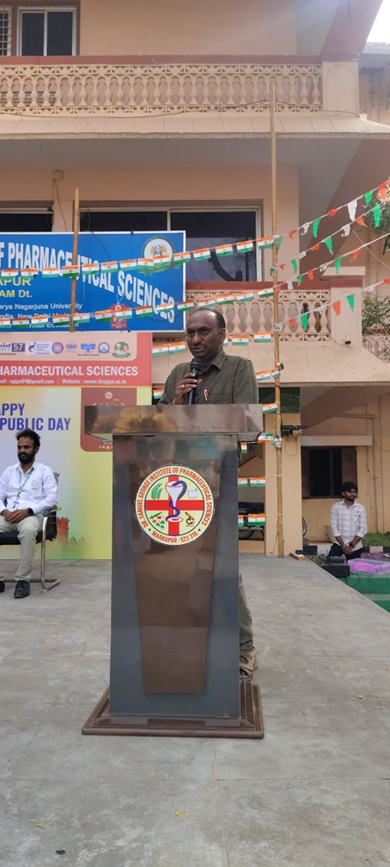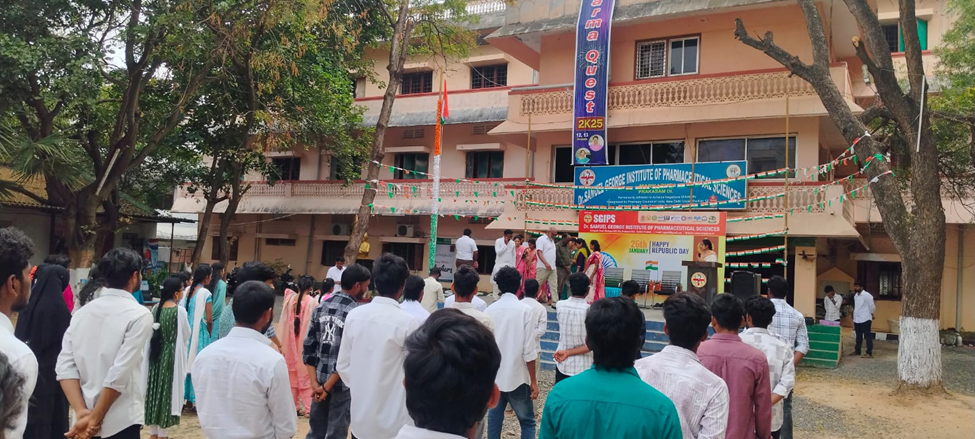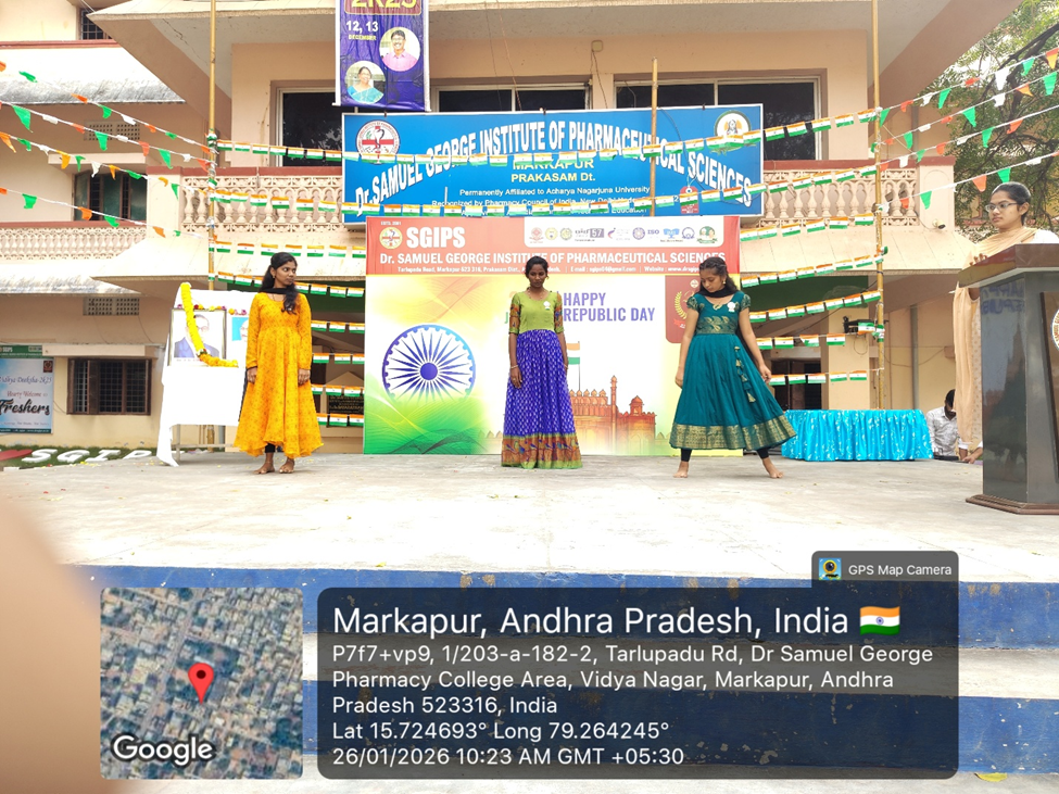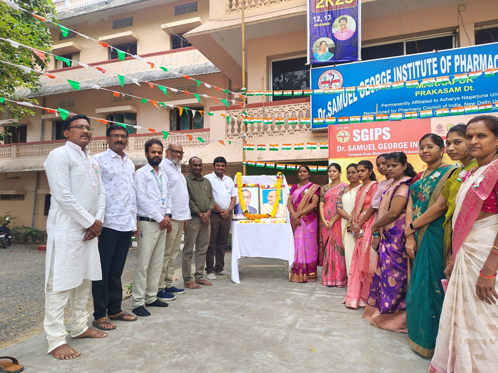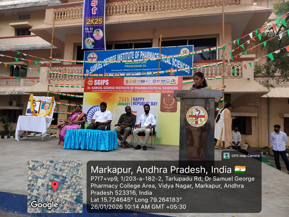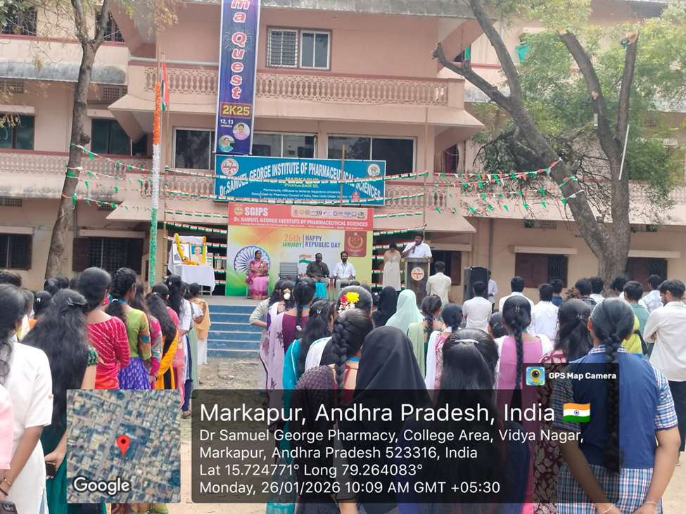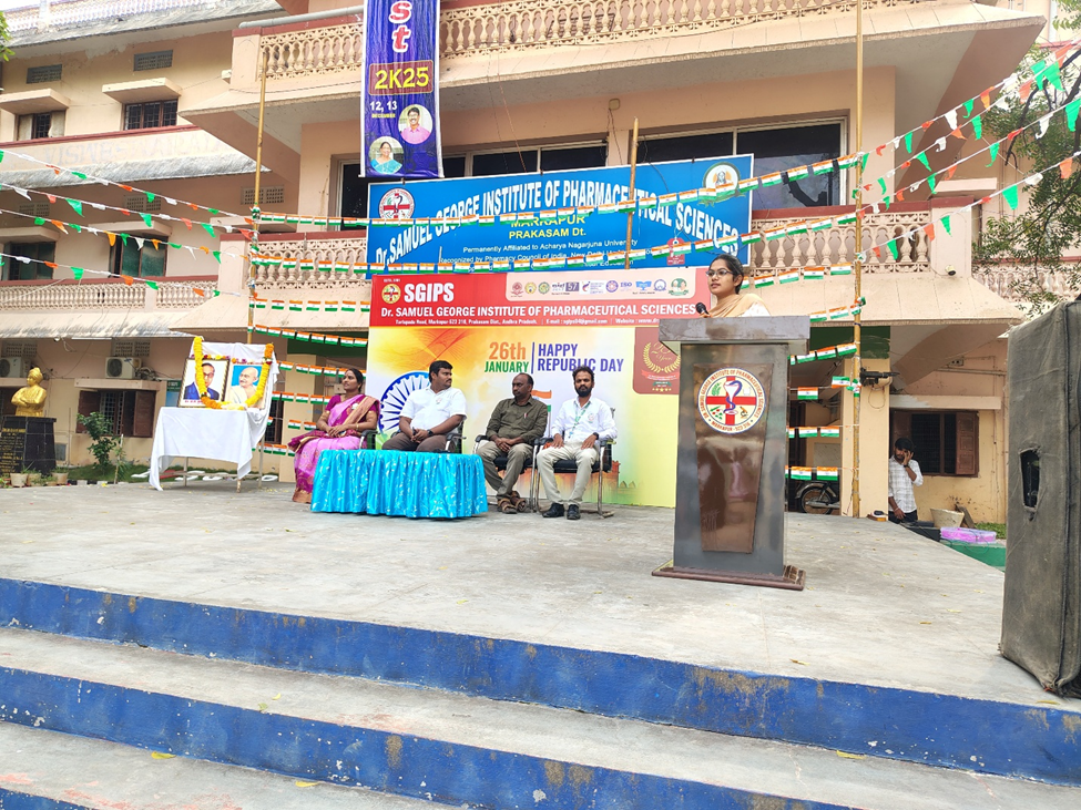 డా. సామ్యుయేల్ జార్జ్ ఇన్స్టిట్యూట్ ఆఫ్ ఫార్మాస్యూటికల్ సైన్సెస్ కళాశాలలో 77వ గణతంత్ర దినోత్సవ వేడుకలు ఘనంగా నిర్వహించబడ్డాయి. ఈ కార్యక్రమానికి కళాశాల ప్రిన్సిపాల్ డా. డి. ప్రసన్న కుమార్ గారు అధ్యక్షత వహించి, జాతీయ జెండాను ఆవిష్కరించారు. ఈ సందర్భంగా ఆయన మాట్లాడుతూ భారత రాజ్యాంగం అందించిన హక్కులు, కర్తవ్యాలపై విద్యార్థులు అవగాహన కలిగి ఉండాలని, దేశ అభివృద్ధిలో యువత కీలక పాత్ర పోషించాలని అన్నారు.